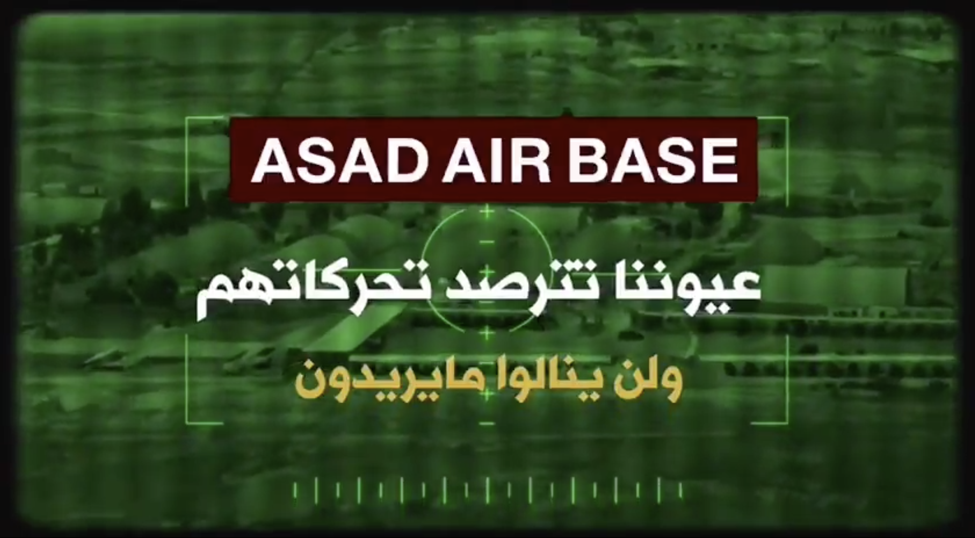 Ytterligere en video ble distribuert til pressen noen dager senere med droneopptak fra den største amerikanske militærbasen i Irak, Ain al-Assad-basen i Anbar-ørkenen. Videoen viste våpenlagre, styrker, bygninger, kommando- og kontrolltårn, hangarer, rullebaner og mange flere detaljer på hele kartet over basen, til tross for amerikansk utplassering av den mest sofistikerte radaren, Patriot-raketter og andre forsvarssystemer som skal sikre basen.