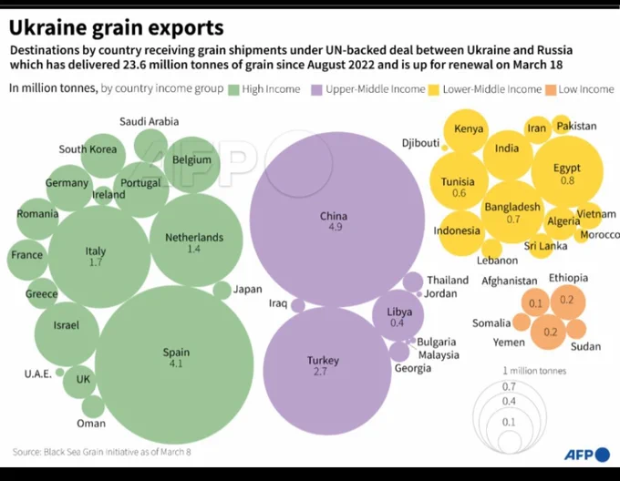 L’Ukraine a exporté quelque 33 millions de tonnes de céréales, dont 9 millions de tonnes de blé. La Chine, la Turquie, l’Espagne et divers pays européens sont les principaux bénéficiaires de ces exportations. L’Afrique n’a importé que 4 millions de tonnes de céréales ukrainiennes : 1,6 million de tonnes sont allées en Égypte et le reste dans des pays au pouvoir économique plus limité. Cette entreprise d’exportation a généré une somme impressionnante de 9 à 10 milliards de dollars, cruciale pour les engagements financiers de l’Ukraine en temps de guerre.