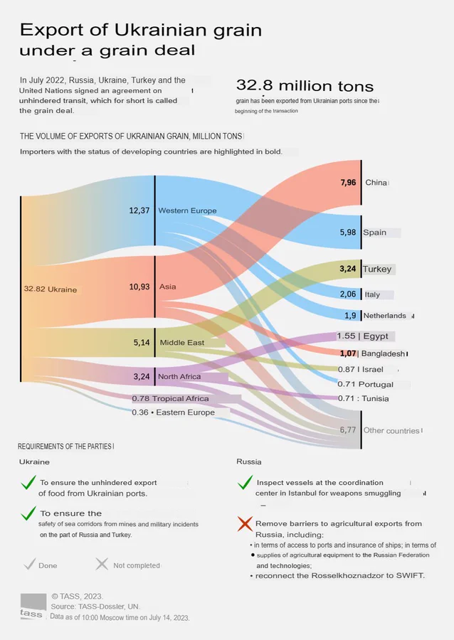 اوکراین موفق به صادرات ۳۳ میلیون تن غلات که شامل ۹ میلیون تن گندم هم است، بوده. چین، ترکیه، اسپانیا و دیگر کشورهای غربی از این معامله بیشترین بهره را داشتند آفریقا فقط موفق به خرید ۴ میلیون تن از غلات اوکراین شده که ۱.۶ میلیون تن آن به مصر فروخته شده. این صادرات برای اوکراین بهره در حدود ۹ تا ۱۰ میلیارد دلار داشته که البته در زمان جنگ بسیار مفید است.برای اوکراین، جریان مالی حاصل از صادرات غلات برای تداوم تلاش های جنگی آن بسیار مهم است. توقف صادرات غلات می تواند عموم مردم اوکراین را بر ضد ریاست جمهوری کشور کند، به خصوص کشاورزان و شرکتهای حمل ونقل را ناراضی کند که به ضرر ادامه جنگ میشود.در نتیجه، امریکا علاقه مند است که حمایت بین المللی برای صادرات غلات اوکراین ولی پوشش تهاجمی رسانه های ضد روسیه را تامین کند. قابل توجه است که درآمد حاصل از فروش غلات اوکراین، کمک مالی بسیاری برای ادامه جنگ توسط کشورهای غربی است. علاوه بر این اگر صادرات غلات اوکراین قطع شود، فشار بسیاری به وارد کنندگان اروپایی وارد میشود و آنها شاید مجبور شوند که این مواد را از روسیه خریداری کنند. به خصوص که روسیه بزرگترین صادر کننده غلات و کود است.روسیه هم به خوبی از پیامدهای استراتژیک در مورد صادرات کشاورزی و ارائه اطمینان به جامعه کشاورزی و تامین ثبات در داخل کشور آگاه است. علاوه بر آن، پوتین حاضر است که از صادرات غلات اوکراین و سود مالی آن حمایت کند اگر در عوض روسیه هم امتیازات متقابل را در یافت کند به مانند اجازه استفاده از سویفت که پول فروش غلات توسط آن پرداخت شود.صادراتبا این حال، بی میلی غرب به اجرای تعهدات خود در قبال روسیه، سؤالاتی را در مورد امکان اجرای توافق را ایجاد میکند. با وجود تلاش های سازمان ملل متحد، طوری که کشورهای غربی عمل میکنند به نظر میاید که آنها به دنبال ایجاد شورش و بی ثباتی در داخل روسیه هستند.رییس جمهور پوتین میخواد که از کشوهای فقیر با تامین غلات و کود حمایت کند و به آنهایی که احتیاج دارند با قیمت کمتر مواد را تامین کند بنابراین کشورهای غربی هم باید برای “ امنیت غذایی” بیشتر فعال باشند. روسیه با بیش از ۲۰ درصد صادرات غلات دنیا،امسال تولید را با ۲۳ درصد افزایش داده و به ۵۵ میلیون تن رسانده که به خوبی نشان میدهد که روسیه میتواند احتیاجات دنیا را فراهم کند. در ملاقات این ماه در سن پیترزبرگ، پوتین به رهبران آفریقایی بیان کرد که او حاضر است که بیش از ۲۳ میلیارد دلار از بدهی های آنها را لغو کند و فقیرترین کشورها را با غلات و کود فراهم کند. اعلامیه پوتین، واکنش شدیدی را از بروکسل نشان داد و جوزوف بورول به کشورهای آفریقایی و اروپایی هشدار داد که زیاد وابسته روسیه نباشند. با اینکه بورول قبول کرد که غلات روسیه تحت تحریم نیست ولی در مورد خواسته مهم روسیه که برای دسترسی بانک کشاورزی روسیه به سویفت باشد جوابی نداشت.با اینکه ادعای اوکراین که روسیه با بمباران بنادر اوکراین بیش از ۴۰٫۰۰۰ تن غلات اوکراین را نابود کرده، مورد توجه قرار گرفته ولی شاید این ادعا برای دشمن نشان دادن روسیه و توافق فروش غلات که بیشتر به نفع اوکراین باشد، است. ولی با وجود فشار از طرف رییس جمهور ترکیه اردوغان، پوتین مصمم است که در قرارداد غلات هر دو طرف باید به تمام موارد آن احترام بگذارند.تلاش های اردوغان که بتواند بر پوتین نفوذ داشته باشد، نشان میدهد که مسایل بسیار پیچیده در جریان است.عدم تمایل امریکا به رعایت شرایط توافق ،در مورد انگیزه های امریکا سؤالهایی را پیش میاورد. با سرزنش کردن روسیه برای کمبود مواد غذایی در دنیا و استفاده از موقعیت ژیو پلیتیک ترکیه ، امریکا سعی دارد که روسیه را منزوی نگه دارد. امریکا امیدوار است که ترکیه به دلیل اینکه کنترل ورود به دریای سیاه را دارد میتواند متحد خود روسیه را قانع کند. پوتین هم به متحد خود که عضویت ناتو را دارد و همکار مهم اقتصادی است، احتیاج دارد.ولی امکان دارد که پوتین راه حلی را پیشنهاد